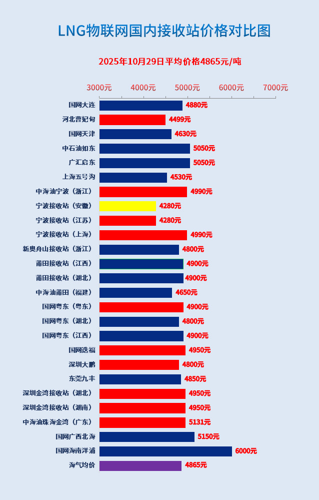19家国内LNG接收站均价为4865元/吨,较高价是国网海南洋浦报价6000元/吨,较低价是中海油宁波(苏、皖)报价4280元/吨。