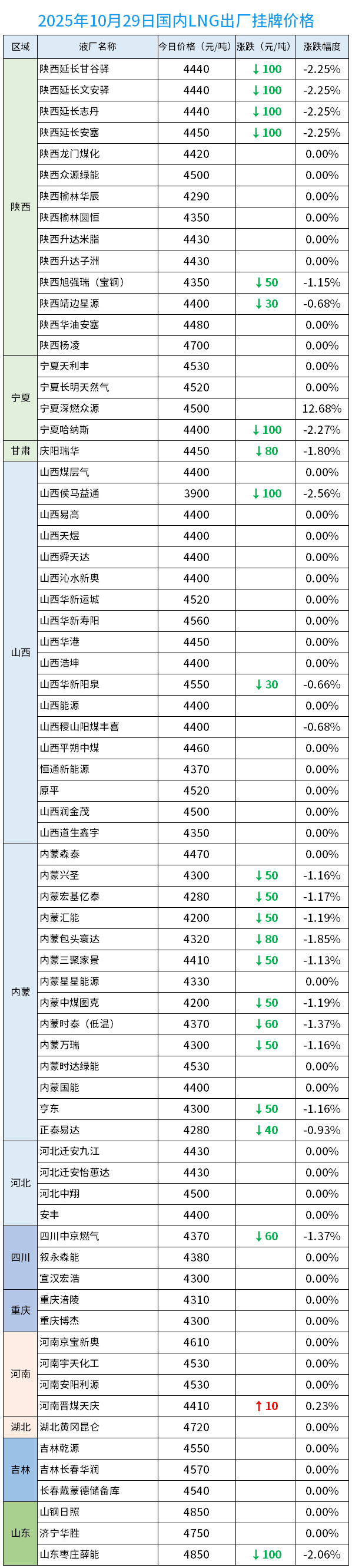 据LNG物联网数据统计:截止2025年10月29日133家国内LNG工厂,62检修/停产/停报/内销,整体对外开工率53%,目前本网统计市场均价为4435元/吨。较高价报价4850元/吨,较低价报价4000元/吨。