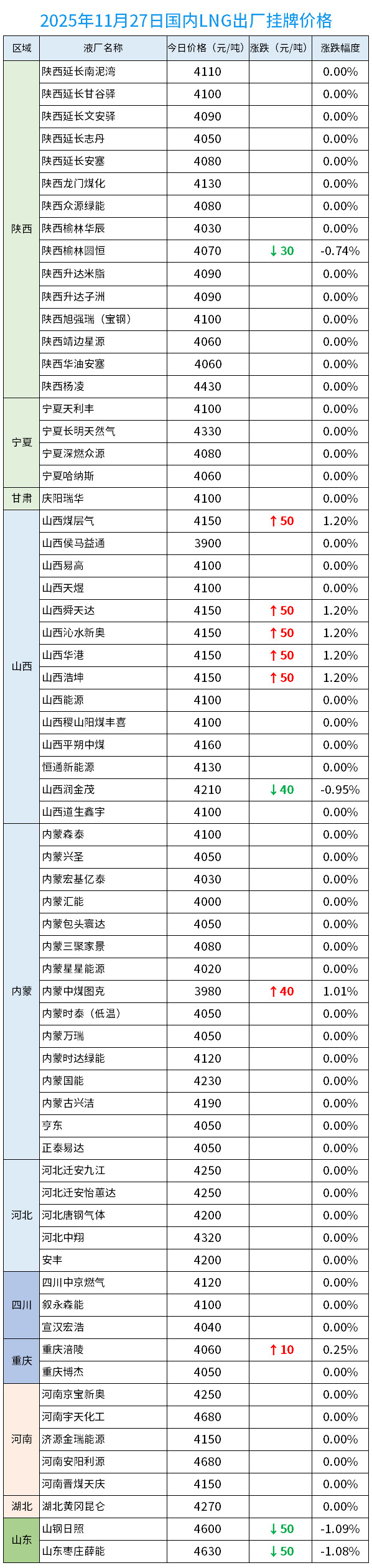 今日国内LNG价格涨跌互现,7家调涨,较高涨幅50元/吨,7家降价,较大降幅50元/吨。中石油直供西部及北方液化工厂的2025年12月上半月原料气竞拍,定于 2025年11月27日10:00-10:20 在重庆石油天然气交易中心正式开展。当前市场层面观望心态升温,多数液化工厂持续面临成本与售价倒挂压力,企业止跌意愿对市场形成一定支撑,部分区域液价已出现小幅反弹迹象。具体来看,陕西、山东地区LNG价格走低,山西区域内涨跌不一,内蒙古、重庆地区LNG价格上扬。海气方面,在保持正常出货的情况下,暂时维稳。
