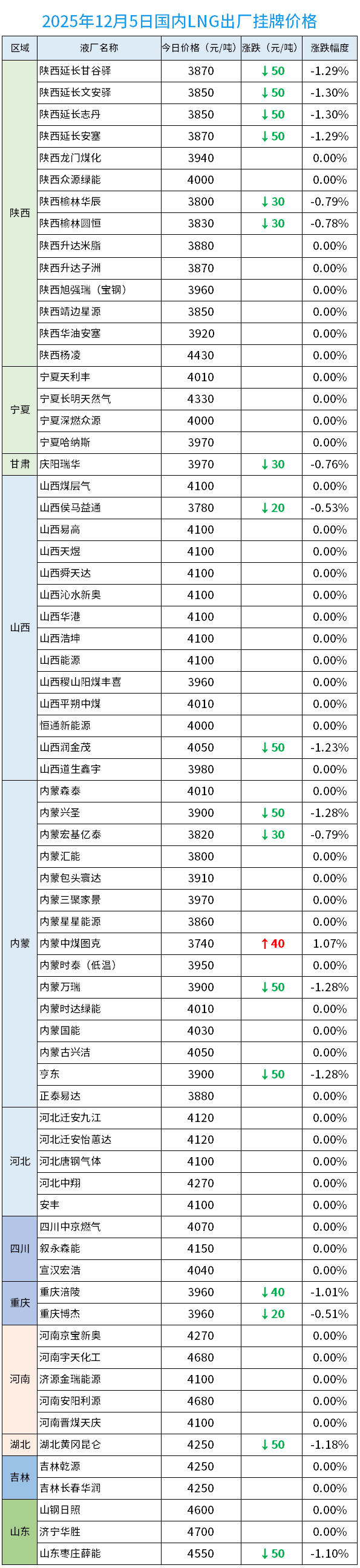 据LNG物联网数据统计:截止2025年12月5日133家国内LNG工厂,64家检修/停产/停报/内销,整体对外开工率52%,目前本网统计市场均价为4056元/吨。较高价报价4700元/吨,较低价报价3740元/吨。