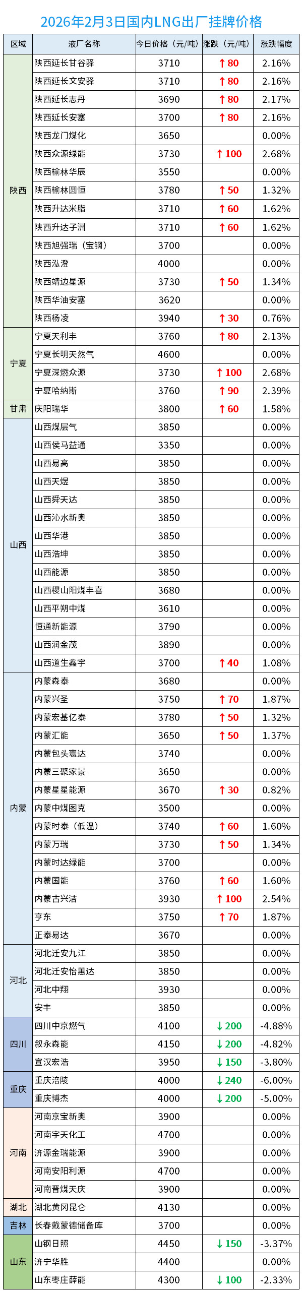 据LNG物联网数据统计:截止2026年2月3日133家国内LNG工厂,65家检修/停产/停报/内销,整体对外开工率51%,目前本网统计市场均价为3851元/吨。较高价报价4700元/吨,较低价报价3350元/吨。