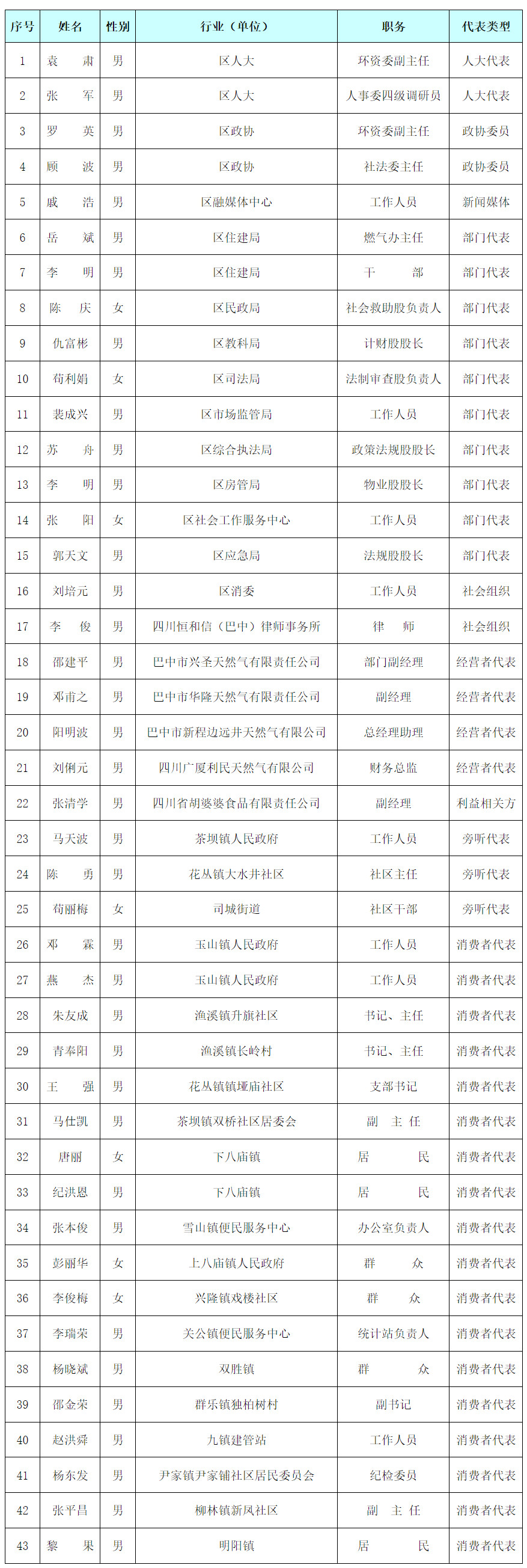 为广泛听取社会各界意见,进一步规范行政决策行为,提高行政决策科学性,切实保障消费者合法权益,根据《政府制定价格行为规则》《四川省发展和改革委员会关于加快推进供气供水价格改革的通知》(川发改价格〔2024〕86号)、《四川省发展和改革委员会关于印发〈四川省城镇管道燃气配气价格管理办法〉的通知》(川发改价格规〔2025〕450号)等精神,经2026年2月25日第一次公告征集本次听证会参加人,通过自愿和推荐两种报名方式已确定听证会参加人40名,听证会旁听人员3名。经研究,决定召开恩阳区集镇(含农村)管道燃气配气价格制定及规范居民用气销售价格听证会。按照相关法律法规规定,现将有关事项公告如下: