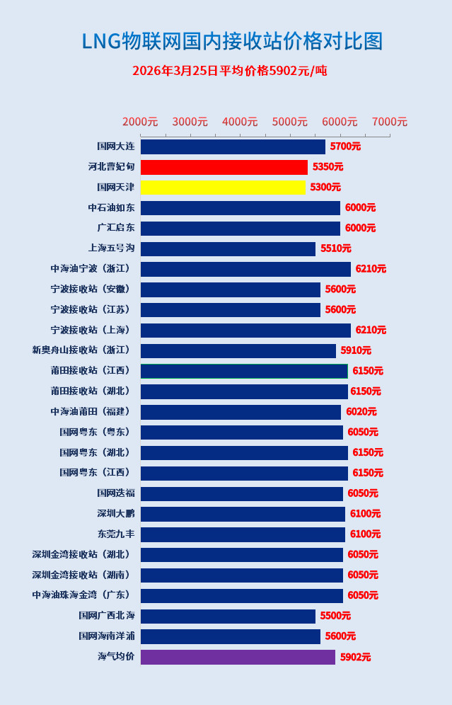 19家国内LNG接收站均价为5902元/吨,较高价是中海油宁波(浙、沪)报价6210元/吨,较低价是国网天津报价5300元/吨。