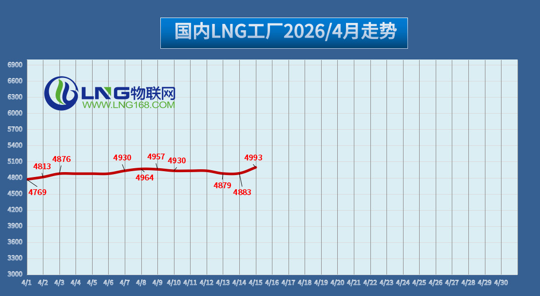 据LNG物联网数据统计:截止2026年4月15日133家国内LNG工厂,70家检修/停产/停报/内销,整体对外开工率47%,目前本网统计市场均价为4993元/吨。较高价报价5100元/吨,较低价报价4830元/吨。