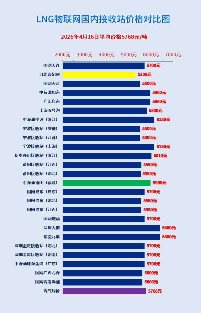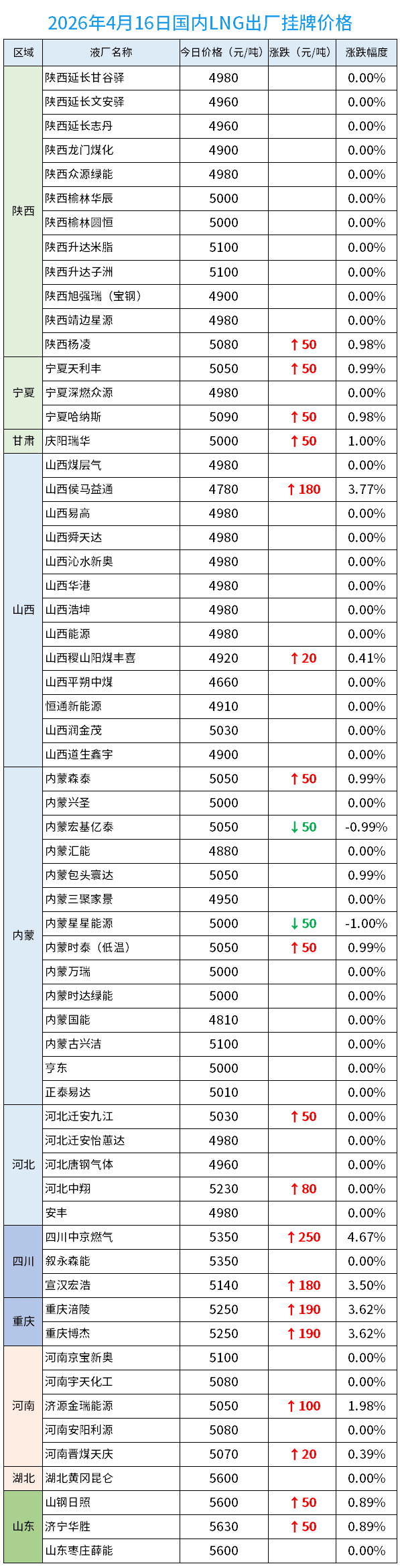 据LNG物联网数据统计:截止2026年4月16日133家国内LNG工厂,71家检修/停产/停报/内销,整体对外开工率47%,目前本网统计市场均价为5055元/吨。较高价报价5630元/吨,较低价报价4660元/吨。