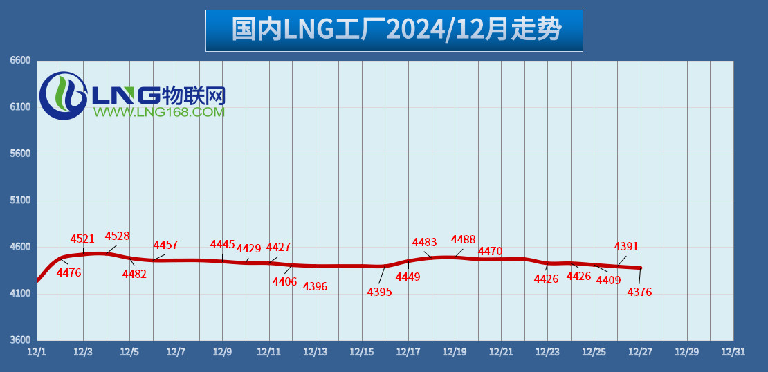 据LNG物联网数据统计:截止2024年12月27日133家国内LNG工厂,61家检修/停产/停报/内销,整体对外开工率54%,目前本网统计市场均价为4376元/吨。较高价报价5200元/吨,较低价报价4100元/吨。